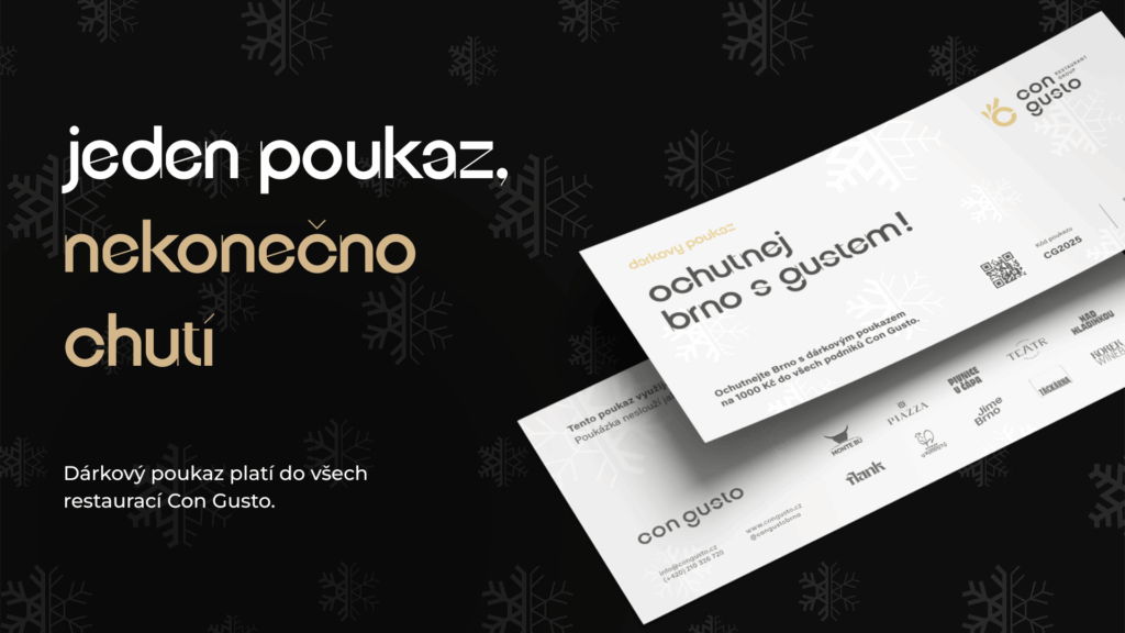 Nestresujte se s výběrem vánočního dárku. S dárkovým poukazem con gusto darujete chuť, zážitek i radost z návštěvy našich restaurací. Každý si vybere podle své chuti – snadno, rychle a bez starostí. Dárkový poukaz je platný po dobu 11 měsíců (335 dní) ode dne jeho vystavení.